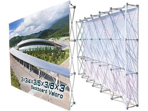 特設イベントブースや展示会、スポーツイベントインタビュー会場、記者会見など多彩にディスプレイできるバックボードベルクロV6×3です。