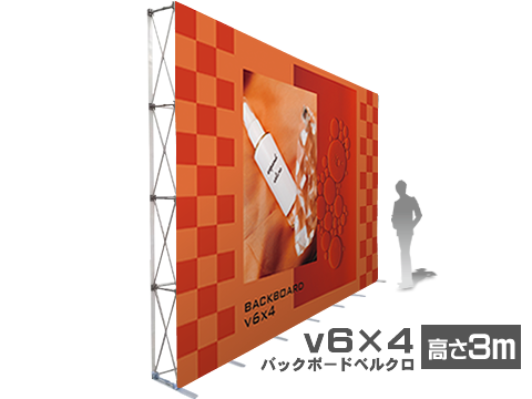 一番のビッグサイズ、4.48m×3mの巨大バックパネル!! V6x4は、圧巻の迫力で宣伝効果抜群のバックボードです。 ベルクロテープ(面ファスナー)で貼り付けるだけの組み立て簡単大型ディスプレイとなります。