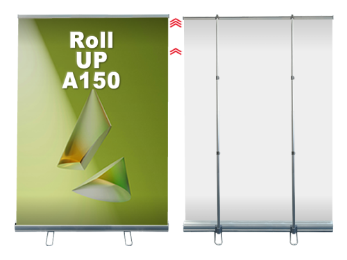 低価格で大きいサイズのディスプレイが可能なロールアップA150です。 最大2mまで高さ調節可能、迫力のあるPR広告に最適です。 記者会見のバックパネル、イベント用看板、案内表示板、企業向け展示会、スポットイベント特設会場など、掲示アイデアが拡がります。