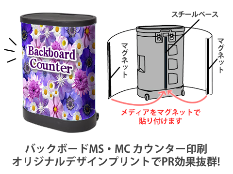 バックボードMS(マグネットストレート)、MC(マグネットカーブ)に付属する収納ケースに、オリジナルデザイン印刷メディアをプラス。カウンター側面に印刷するアイテムです。 オリジナルのグラフィックデザインや企業ロゴ、キャンペーン告知、店舗情報など自由にデザインレイアウトできます。 バックボードカウンターは上部にもオリジナルデザイン(バックボードカウンターパッド)をご用意いたしました。 メディア印刷することで、収納ケースがグレードアップ+ひときわ目立つ装飾テーブルとしてお使いください。