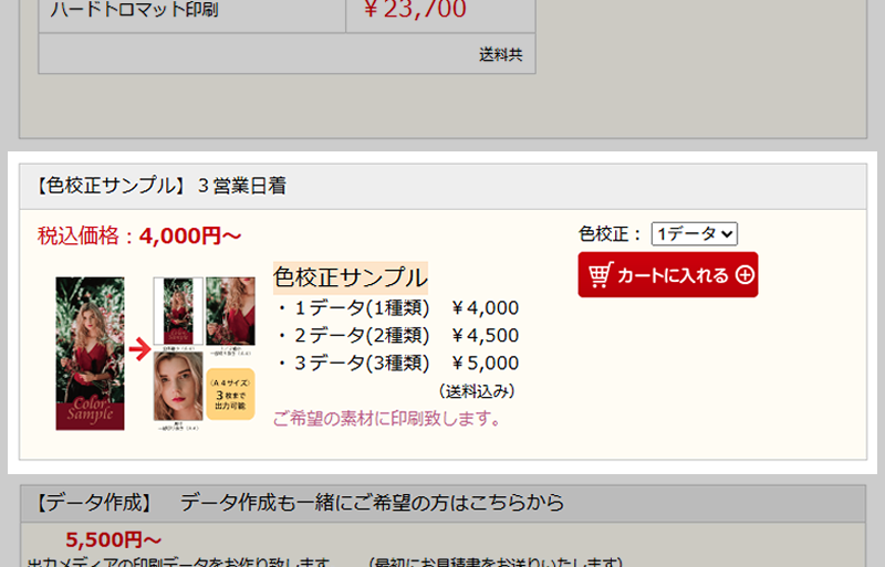 バナーコンテンツ内の商品ページに、色校正サンプルを注文できる項目を追加しました。