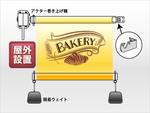 店頭幕昇降スクリーン ミニアクター:設置例 下にウエイトを付けると安定します。 -